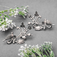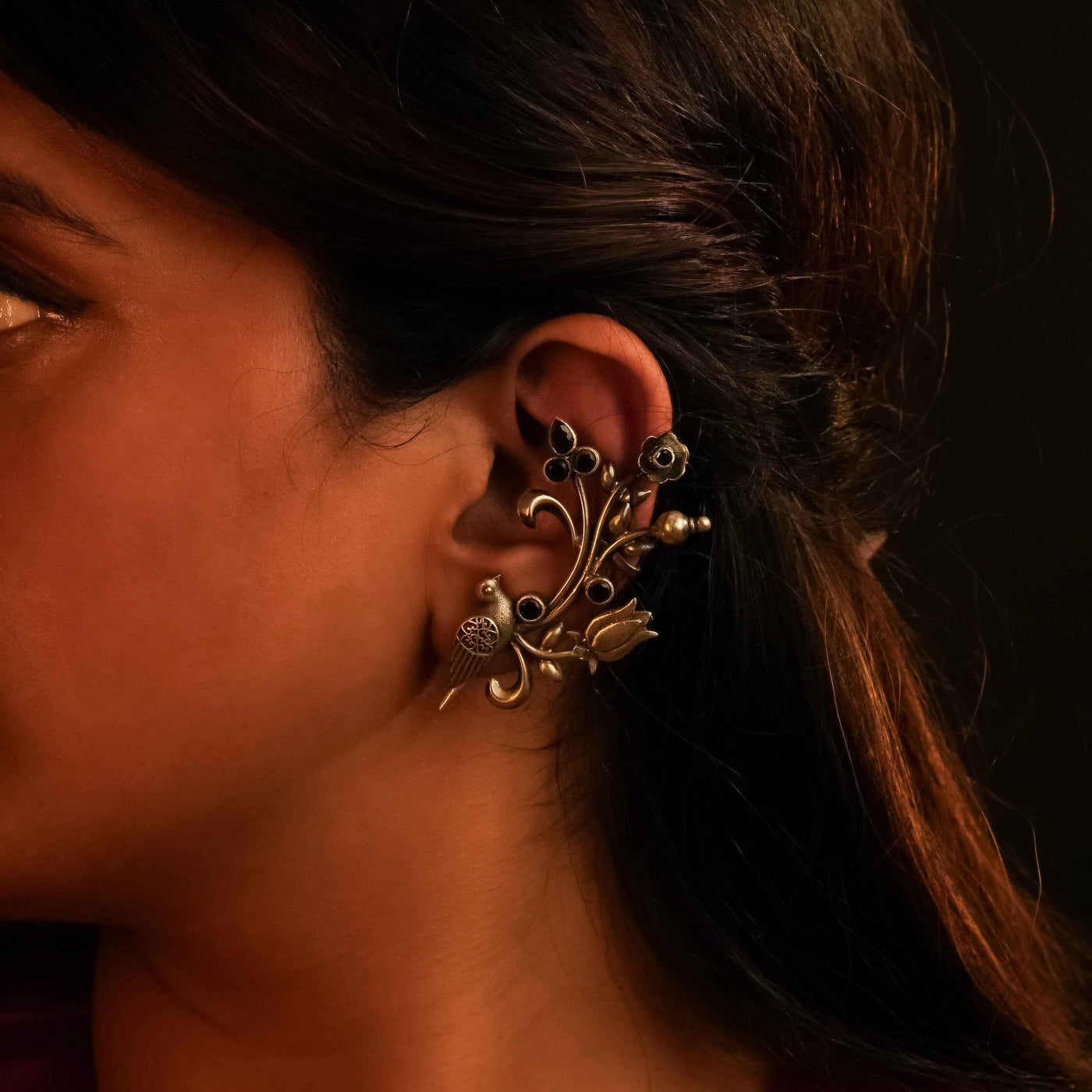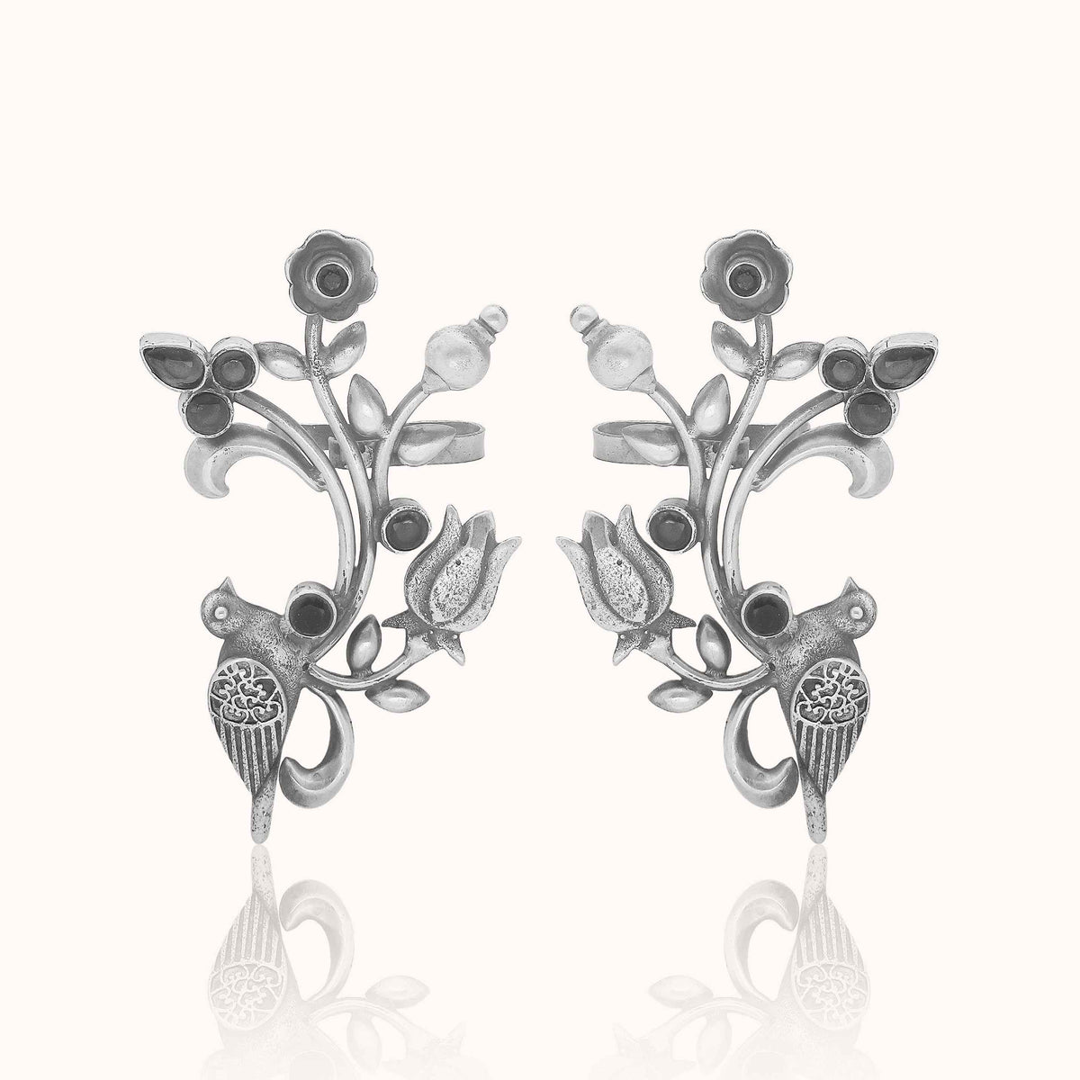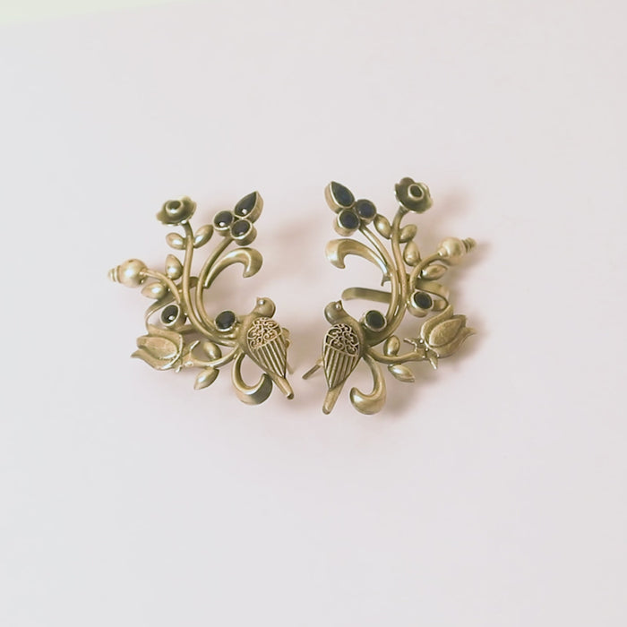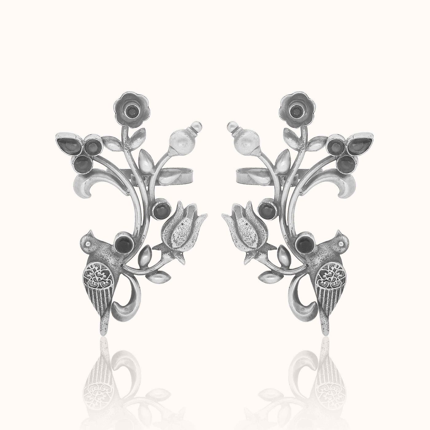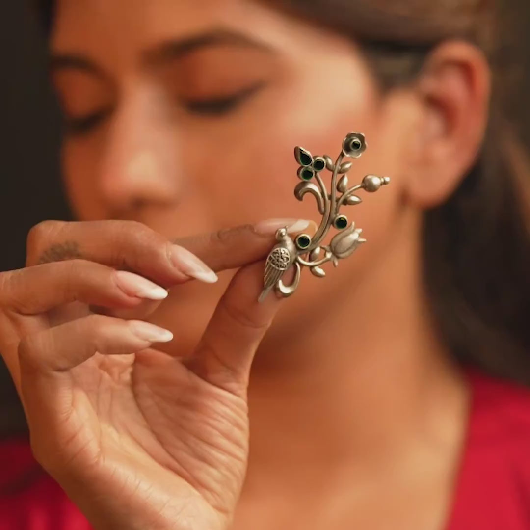 This Noorish 925 silver ear cuff features a majestic bird perched on a vine adorned with striking black accents, exuding dramatic sophistication. With intricate detailing of the vine, leaves, and flowers, add a touch of nature-inspired elegance, making it a must-have for versatile styling.
